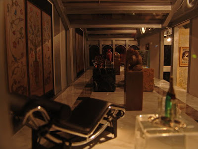 With some solid walls for paintings and niches for sculpture, the intimate gallery is a unique platform for displaying spot lighted miniature art in a setting that is itself bold and artistic rather than simply functional.