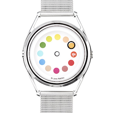 Cyclops dispenses with a conventional arrangement of hour, minute and second hands; instead a single hour marker passes around the coloured dial. Each hour is represented by a different coloured circle, the black hoop gradually passes over each circle to indicate the time.