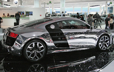 There's been some hubbub over the chrome finished Audi R8 in this years' 2009 Frankfurt Auto Show. The shiny R8 5.2 FSI V10 coupe shown above and below has been turning heads and making the blogs, car mags and auto news.