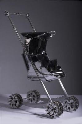 Meticulously assembled in stainless steel from intricate mechanical drawings, they include a deadly Carriage; a sadistic Cradle; a sinister Walker; and a malicious, multi-part Toy complete with needle-tipped pacifiers and dismembering abacus. Baby Boutique confronts its "shopper" with a radically strange and seductive "product," lethal luxury designed to reveal the forces that dominate our lives in unimaginable ways. - above text courtesy of Absolute Arts
