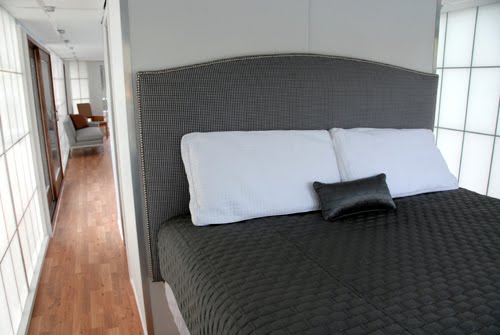 The 48ft x 12ft modern houseboat was inspired by the open plan of NY loft spaces and has 7 foot high interior ceilings. After 7 years of design & development, the floating modern retreat is completely outfitted with the finest appliances and furnishings including a Viking and Gaggenau kitchen, Italian marble bathroom vanity with Kohler shower, a Bang & Olufsen stereo sound system, Sony LCD HD tvs , Nintendo Wii, an LG washing machine and the W Hotel bed.